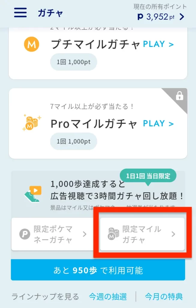 1000歩達成すると限定マイルガチャ有効化