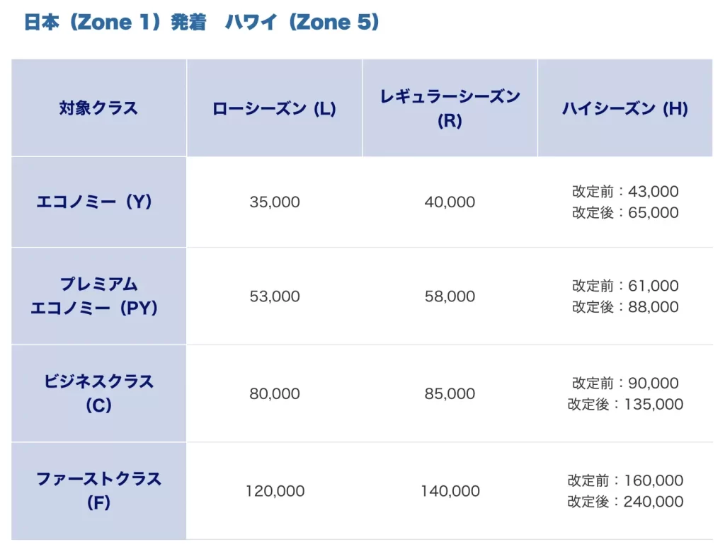 ハワイはローシーズンのエコノミーでも 35,000 マイル必要、、、