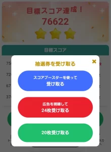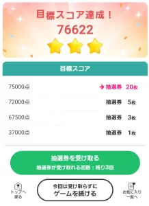 ゲームが終わるとスコアに応じて抽選券を獲得できます。